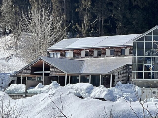 今回は、裏側にある露天風呂の除雪状況をお届けします。この露天風呂、営業中であれば温泉の排水をデッキ部分に溜めて雪を溶かしてくれるのですが、流れが止まると一変。あっという間に雪に飲み込まれてしまいます。