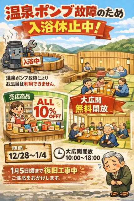 当館は12月26日(金)朝より、温泉ポンプの故障により温泉の供給ができない状況が続いております。