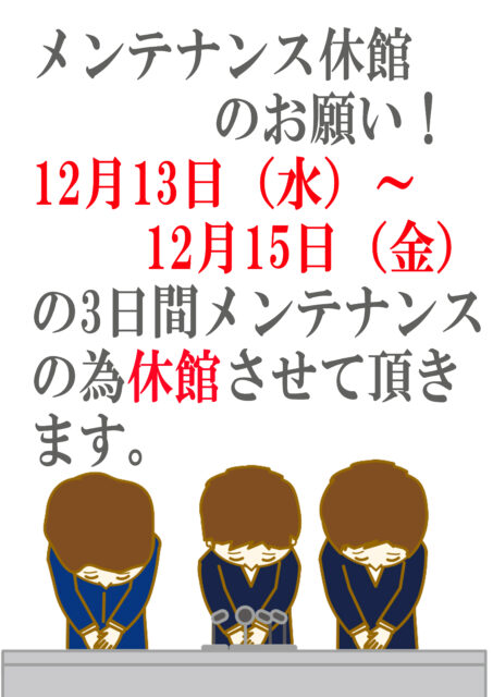 12月13日より15日まで3日間、メンテナンス作業の為休館いたします。 よろしくお願いします。